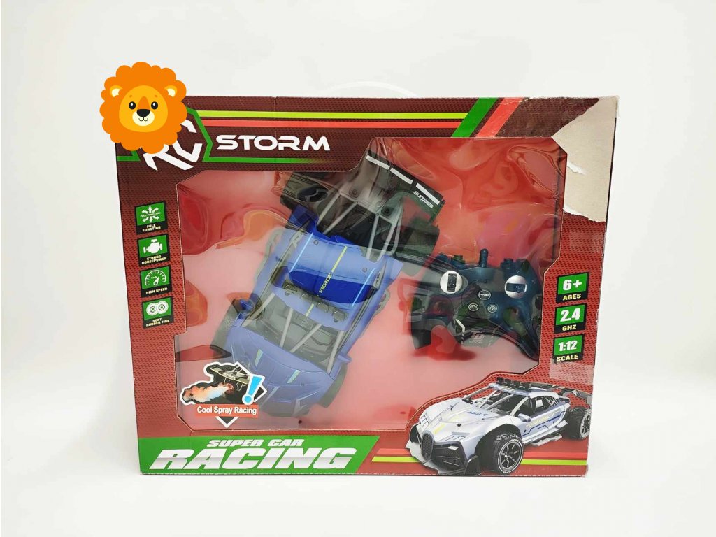 Auto RC závodní vypouštějící páru plast 30cm 2,4GHz na bat. + dobíjecí pack v krabici 43x35x12cm