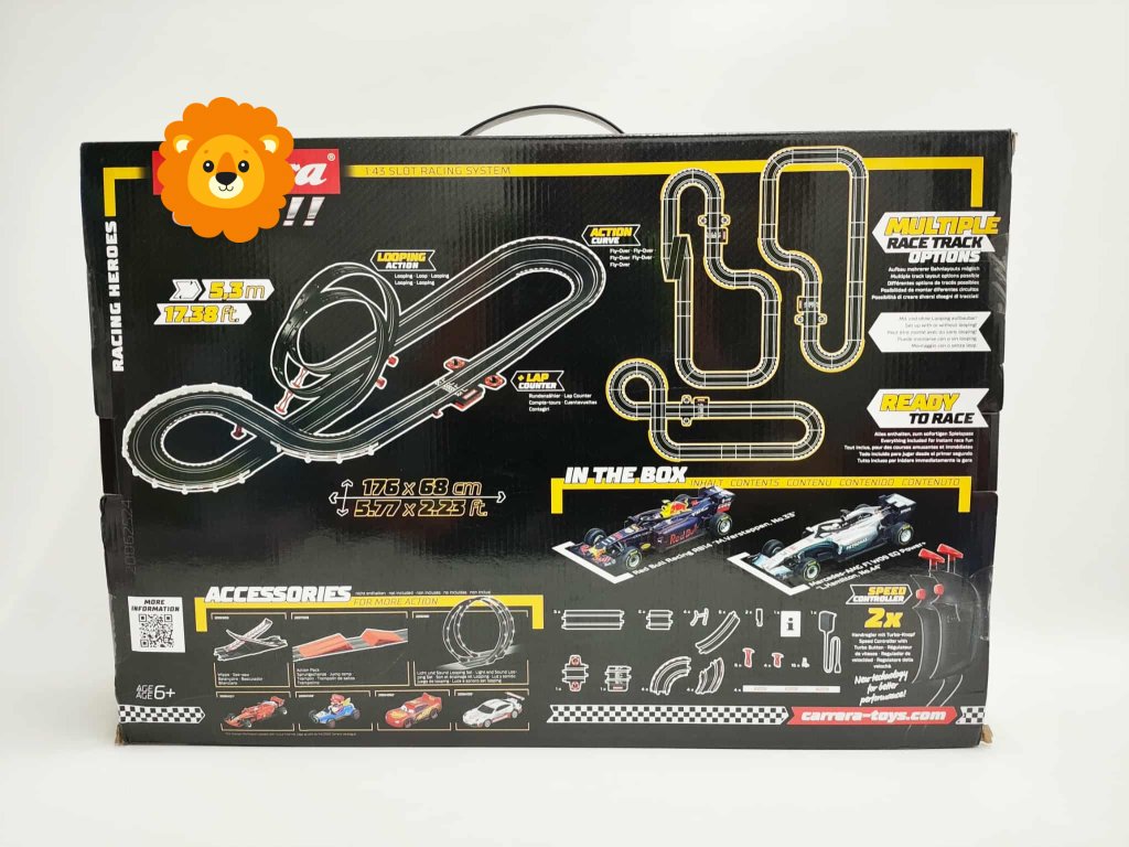 Autodráha Carrera GO!!! dlouhá 5,3m s auty F1 Mercedes a Red Bull, obsahuje klopenou zatáčku, looping, rovinky, zatáčky, díl s počítadlem kol a další díly. Můžete si sestavit další různé trati podle plánu na obalu. Délka trati: 5,3 m. Rozměry po sestavení: 176 x 68 cm. Obsah balení: 1x auto Mercedes-AMG F1 W09 EQ Power+ Lewis Hamilton No.44, 1x auto Red Bull Racing RB14 Max, Verstappen No.33, rovinky, zatáčky, klopenou zatáčku, looping, 1x napájecí díl (61666), 1x díl s počítadlem kol (88107), 2x ovladač rychlosti (61663), 1x trafo, podpěry, mantinely, náhradní kontaktní kartáčky, náhradní vodící lišty, návod. Rozměry balení 58 x 40 x 10 cm. Vhodné pro děti od 6 let.