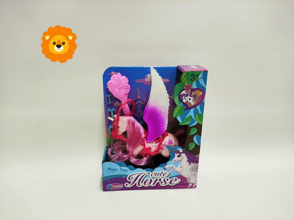 Jednorožec/kůň s křídly česací s hřebenem plast 22cm 3 barvy v krabičce 17x22x6cm
