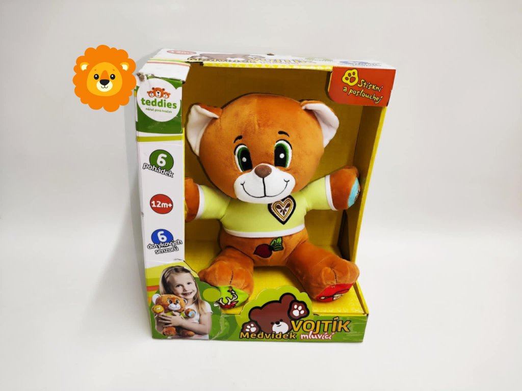 Veselý medvídek Vojtík z plyše vypráví dětem 6 známých českých pohádek. Stačí zmáčknout jeden ze symbolů na jeho těle a poslouchat pohádku o: O neposlušných kůzlátkách, O veliké řepě, O Smolíčkovi pacholíčkovi,Červená Karkulka, Perníková Chaloupka, O Budulínkovi. Vhodný od 1 roku.