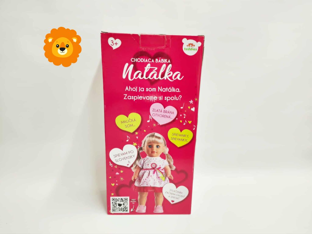 Pořiďte vaší holčičce milou společnici. Chodící panenka Natálka je jako živá. Po stlačení tlačítka na bříšku začne panenka chodit a zpívat. Nejdříve se představí a pobízí dítě, aby zpívalo s ní. Poté začne zpívat známé písničky. Natálka má dlouhé vlásky, které mohou holčičky česat, zdobit a upravovat. V poloze na zádech panenka zavírá oči. Roztomilý obličej a krásné oči zaručují, že si panenku Natálku jistě zamiluje každá malá dívenka.