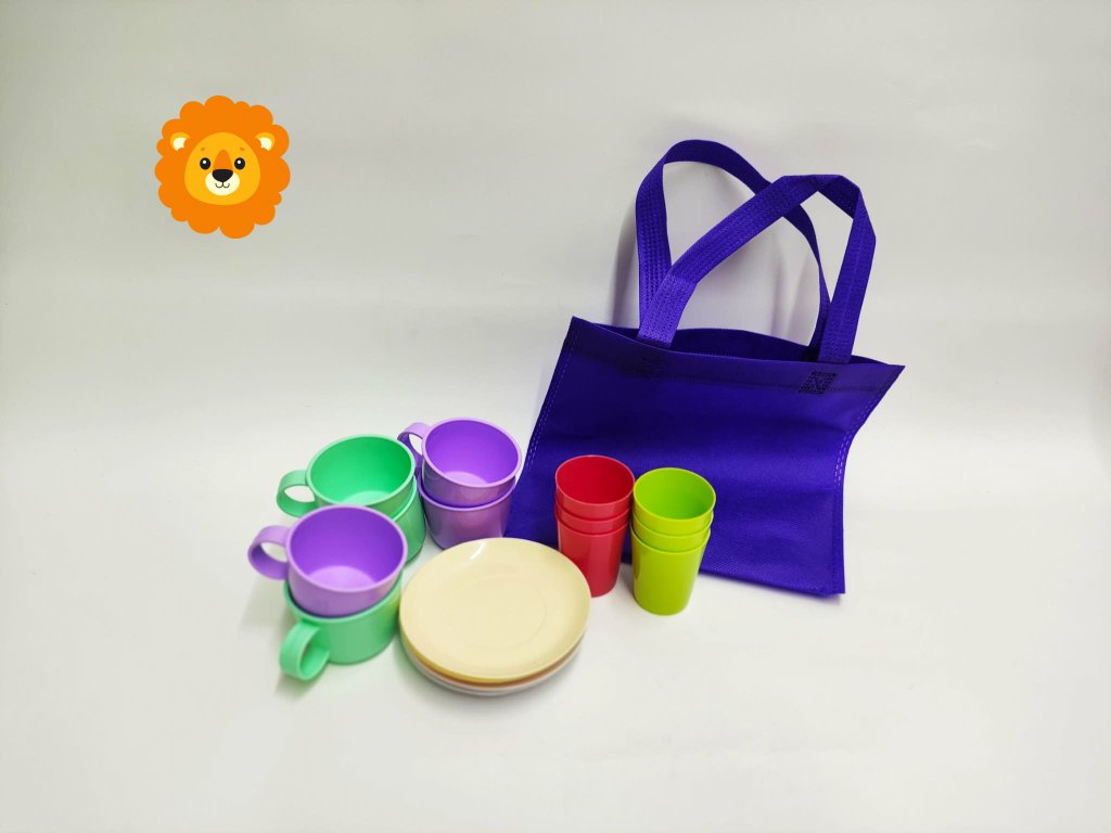 Sada nádobí obsahuje po 6ti kusech šálek, kelímek a talířky. Je uložena v praktické taštičce a zajisté potěší každou malou hospodyňku. Na výběr máte ze 4 barev tašky.