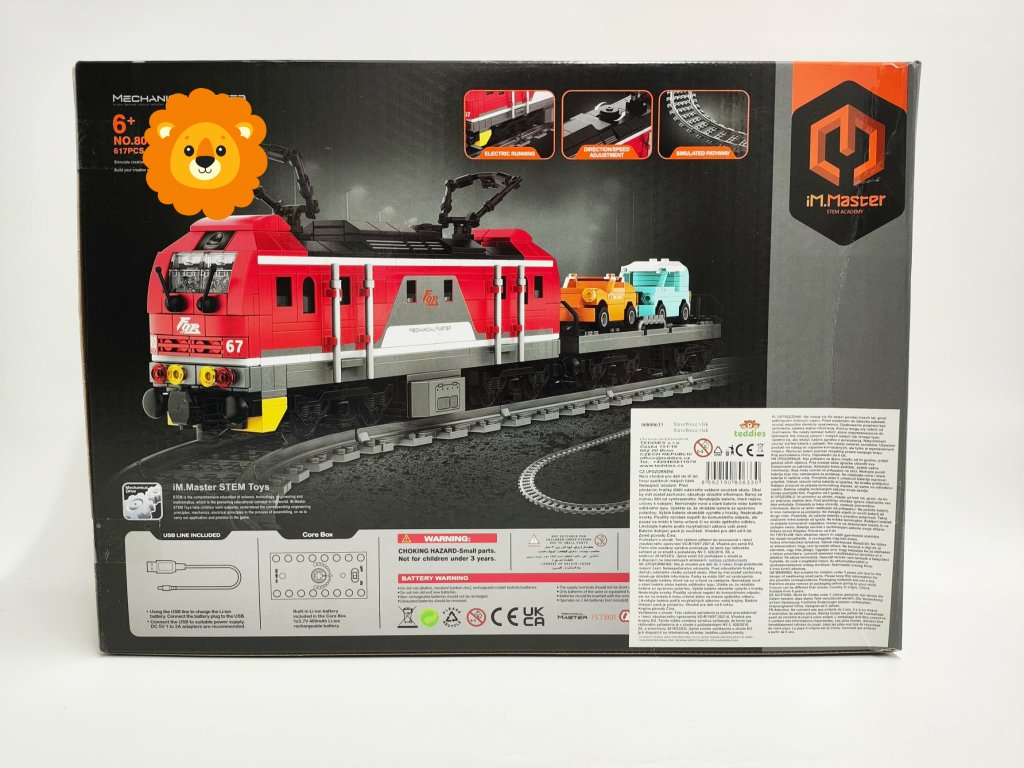 Postavte si vlastní železnici s detailní stavebnicí iM.Master a vyrazte na trať! Model lokomotivy s vagóny a kolejemi nabídne RC ovládání 2,4 GHz se stabilním signálem a dosahem až 25 m, možnost ovládání přes mobilní aplikaci, a navíc 617 dílků pro kreativní stavění. Součástí jsou i doplňky včetně přepravních aut a dobíjecí pack pro delší zábavu.Objevte zábavu ze stavění i řízení s realistickým modelem lokomotivy s vagóny, kolejemi a bohatým příslušenstvím. Stavebnice iM.Master je ideální pro malé i velké konstruktéry, kteří chtějí kombinovat kreativní tvorbu s moderním dálkovým ovládáním.Díky frekvenci 2,4 GHz se můžete spolehnout na stabilní spojení a dosah až 25 metrů. Vlak lze pohodlně ovládat nejen RC ovladačem, ale také mobilní aplikací. Sestavený model o rozměrech přibližně 53 × 12 × 20 cm vypadá skvěle na kolejišti a potěší detailními prvky včetně přepravních aut na vagónech.617 dílků pro dlouhé hodiny zábavy a stavěníRC ovládání 2,4 GHz – stabilní signál bez rušení.Ovládání přes mobilní aplikaci pro moderní zážitek z jízdyRealistické provedení lokomotivy, vagónů a kolejíDobíjecí pack součástí – méně starostí s bateriemiSTEM hračka – rozvíjí kreativitu, technické myšlení a jemnou motoriku.OvládáníRC ovladač a mobilní aplikace.Dobíjecí pack (součástí)