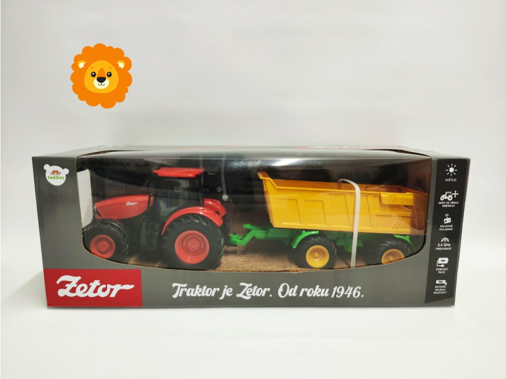 RC model traktoru Zetor od značky Teddies je vhodný pro děti od 3 let. Traktor s valníkem je nepostradatelným pomocníkem pro každého malého farmáře. Valník můžete jednoduše odpojit a traktor využít k dalším pracím. Traktor jezdí na dálkové ovládání s frekvencí 2,4 GHz. Zmáčknutím tlačítek traktor vydává reálné zvuky a svítí mu světla. Velikost traktoru s valníkem činí 42 cm.