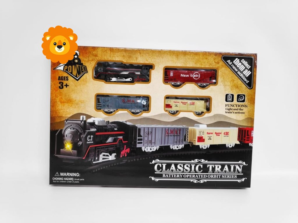 Vlak+3 vagóny s kolejemi se světlem v krabici 46x32x5cm na baterie, plast 104x68cm